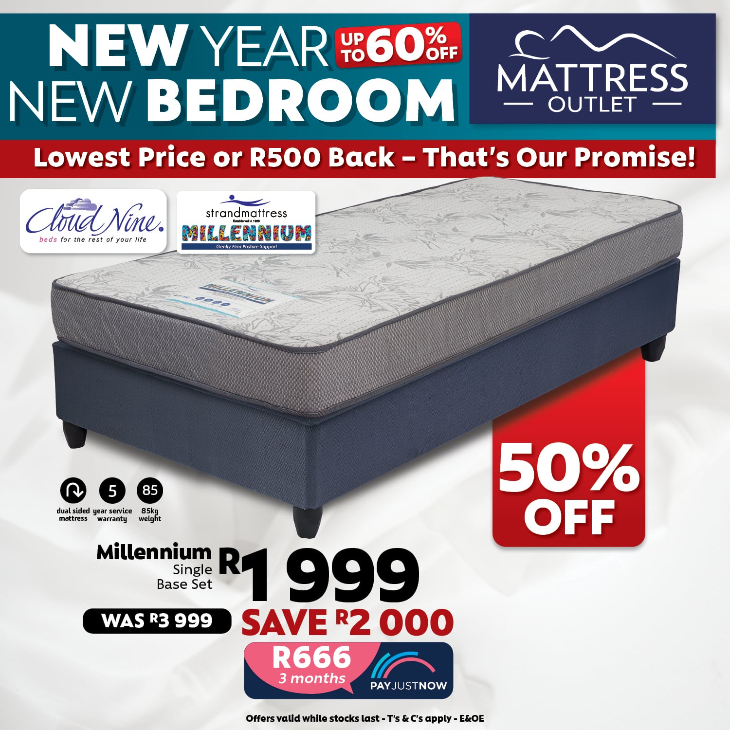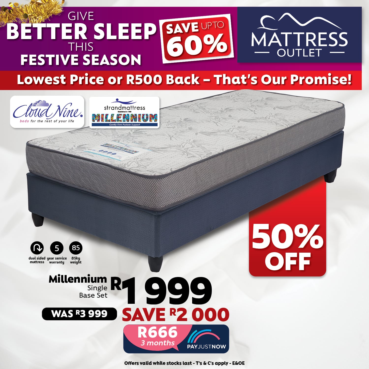 The Strandmattress Millennium Mattress and Base delivers exceptional gently firm posture support, ideal for a refreshing night’s sleep. Featuring a dual-sided design, this mattress offers consistent comfort and durability, thanks to its high-quality single-layer reconstituted polyurethane foam. This sturdy Posture Support Core actively corrects your sleeping posture, providing you with perfect support to relieve back or joint aches.